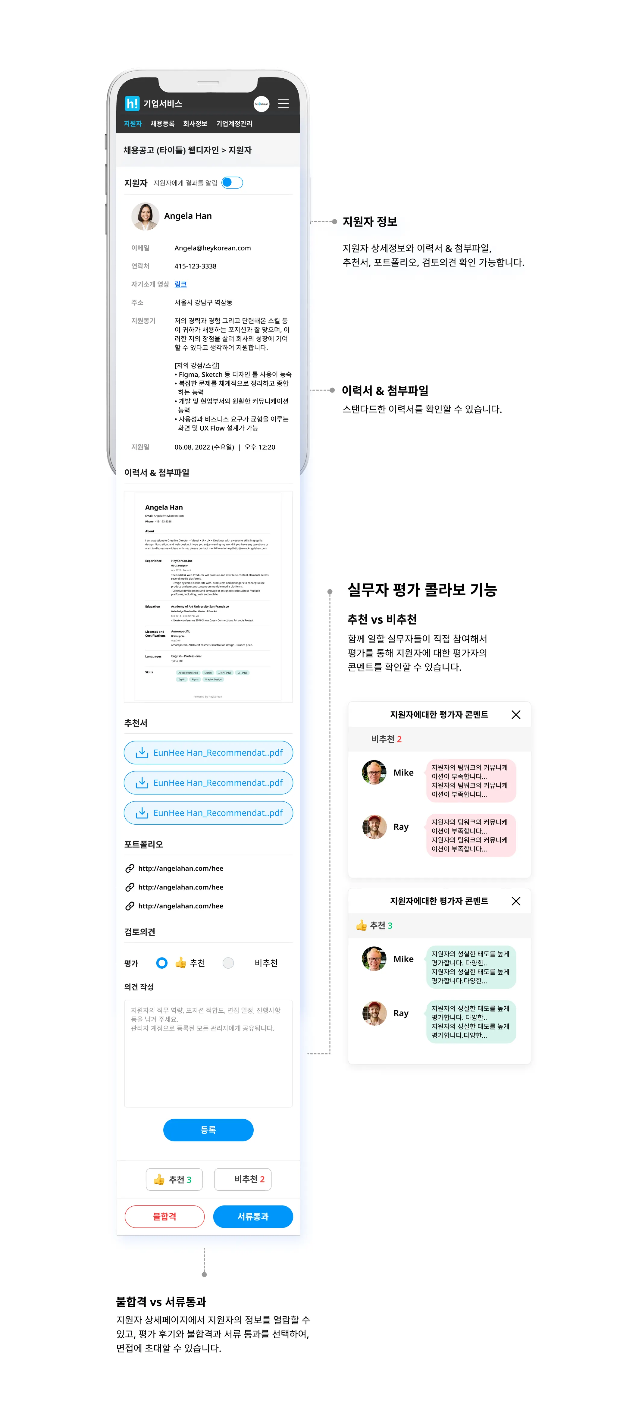 지원자 상세 정보에 실무자들의 평가까지 함께 기록되므로 인재Pool을 효과적으로 관리할 수 있습니다.