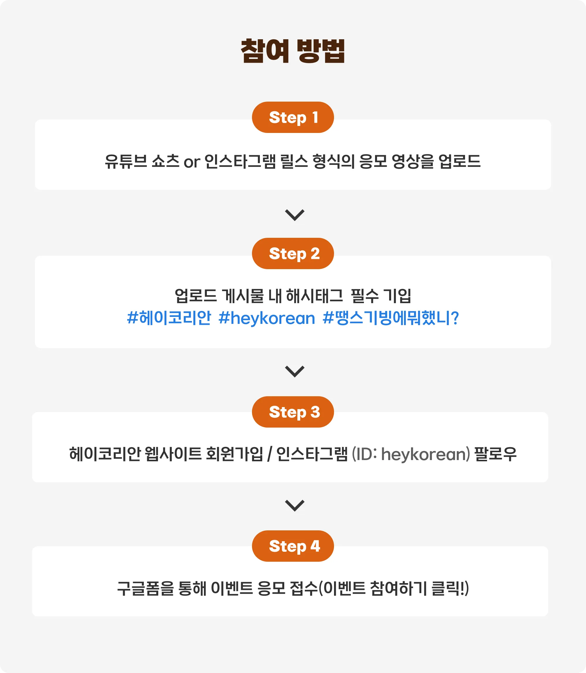 이벤트 당첨자의 영상 라이선스는 HeyKorean, Inc로 귀속되며 당사 공식 유튜브 채널 업로드 등 브랜드 홍보에 활용될 수 있습니다.