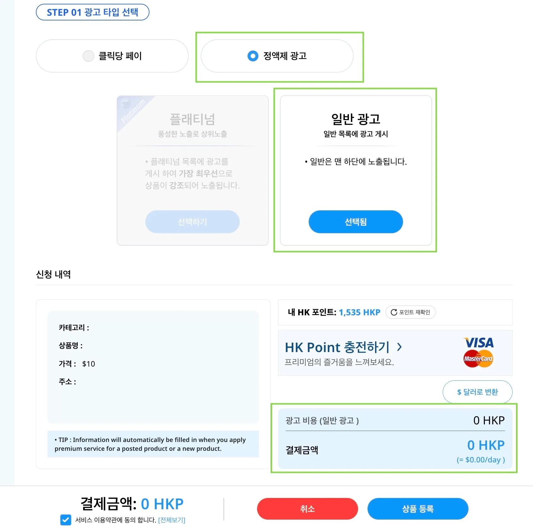 아래와 같이 정액제를 선택하신뒤에 일반리스트를 누르시면 결제할 금액이 0 HKP임을 확인할 수 있습니다.