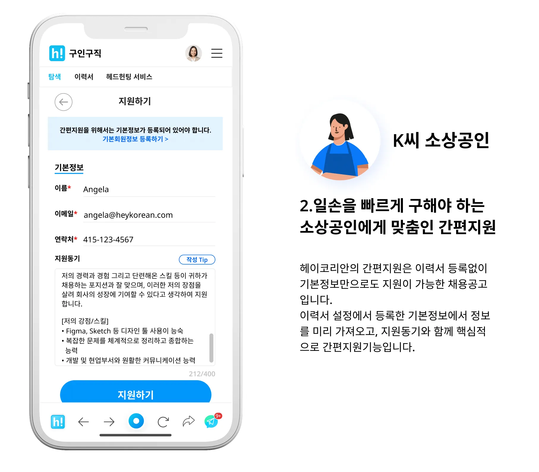 간편지원받기는 구직자가 이력서 없이 연락처만으로 지원 가능한 기능입니다.