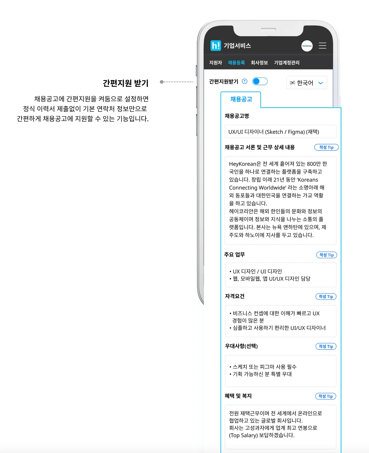 채용공고를 작성하실 때, 간편지원받기를 활성화하시면, 간편지원가능 기업으로 등록됩니다.
