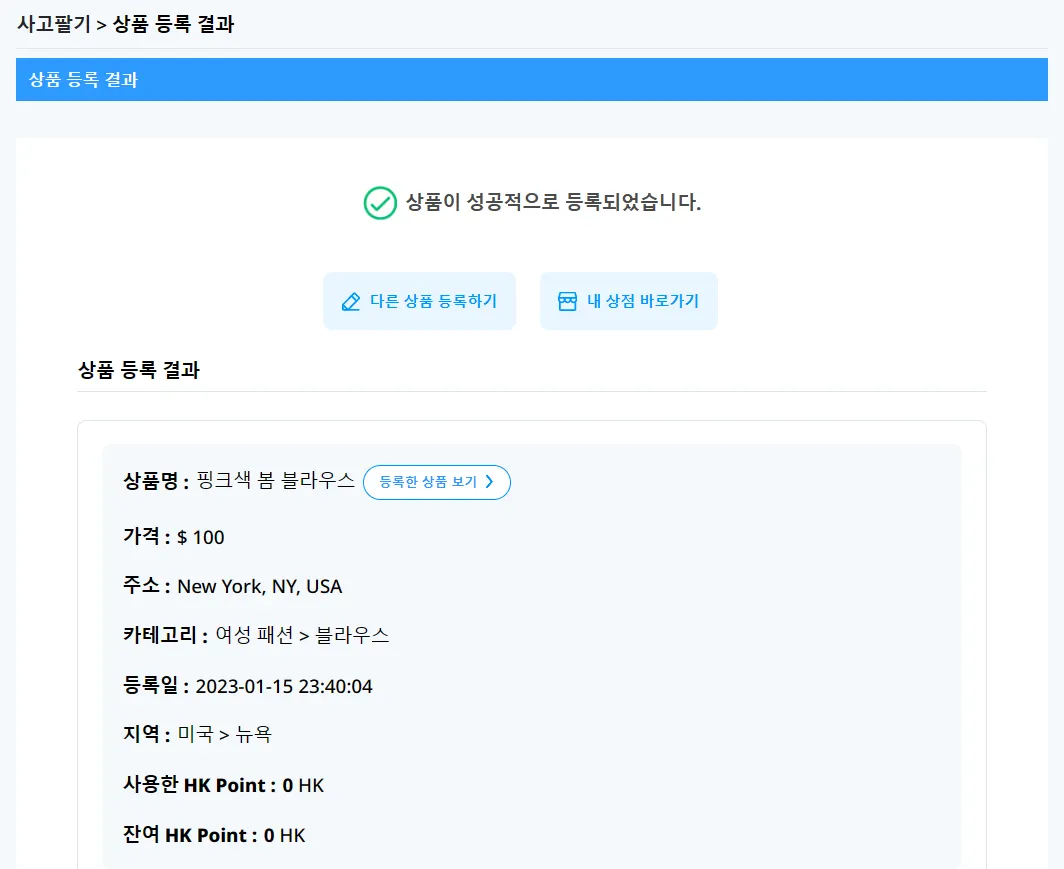 그리고 나서 상품 등록 버튼을 클릭하면 글 작성이 완료됩니다.