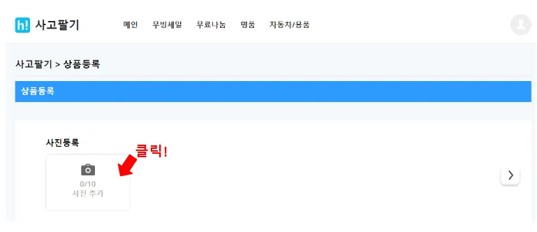 상품등록 페이지에서 먼저 카메라를 클릭하여 사진을 올립니다.