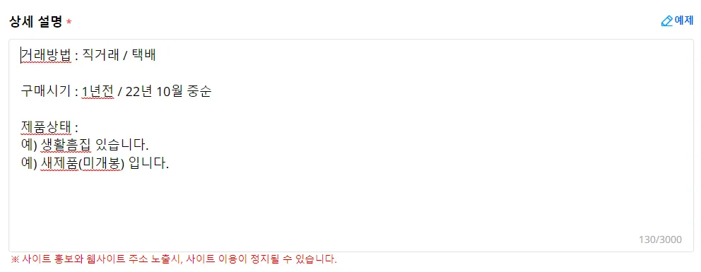 상세 설명에서는 거래방법, 구매시기, 제품상태 등을 보통 설명합니다.