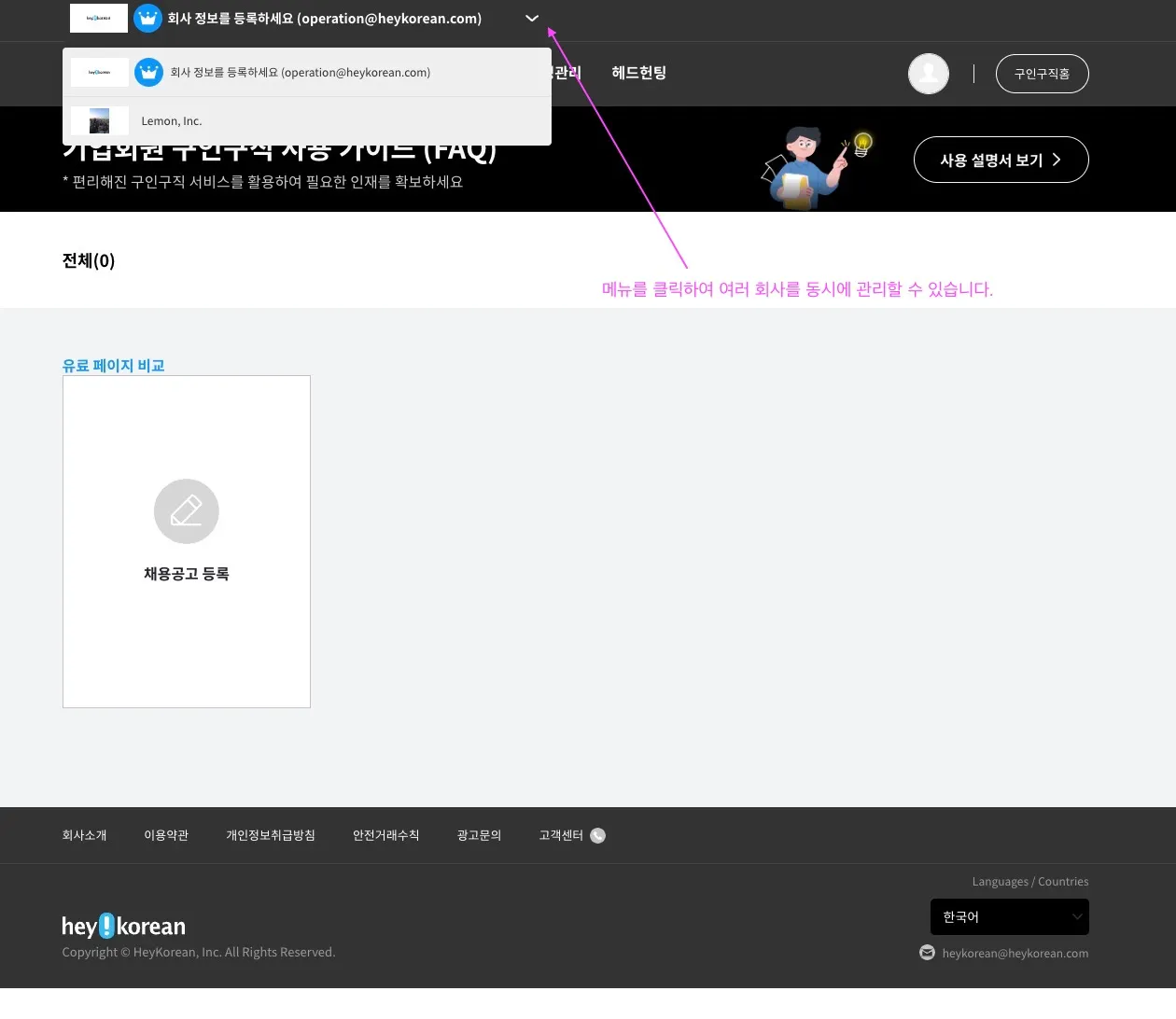 또한 새로운 계정의 관리자(헤이코리안 ID)를 초대하여 기업 계정 관리 권한을 부여할 수도 있습니다.