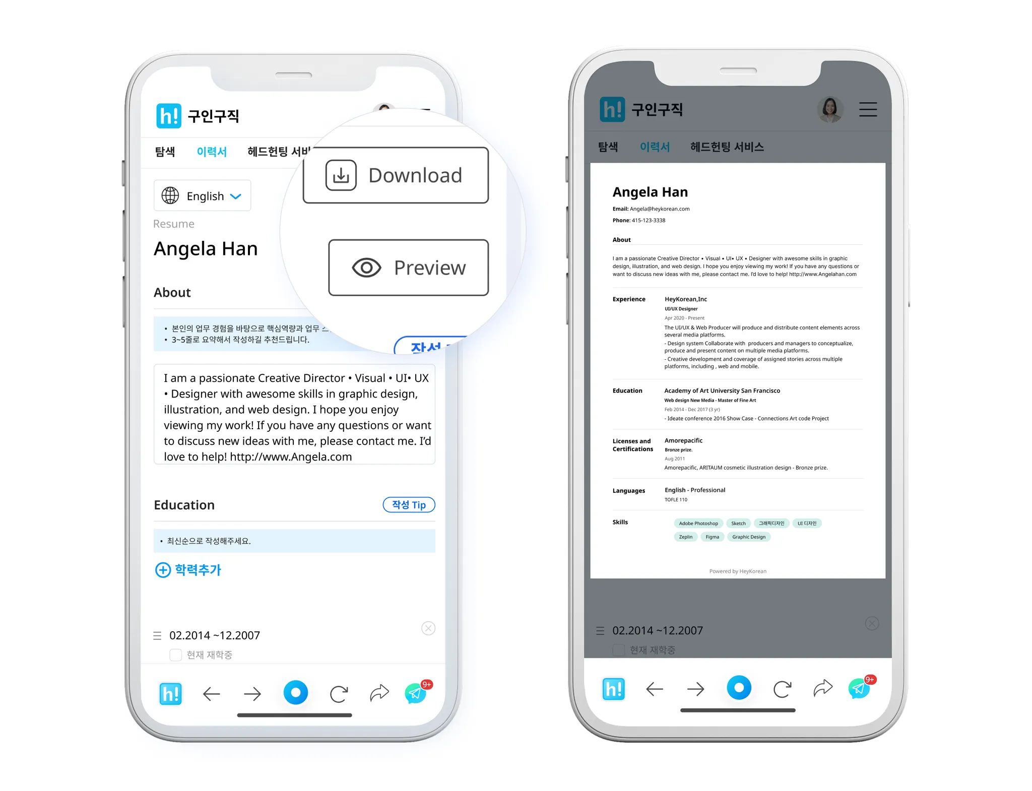 작성한 이력서를 PDF 문서 형식으로 미리 볼 수 있으며, 다운로드하여 언제 어디서나 간편하게 전송하거나 프린트할 수 있습니다