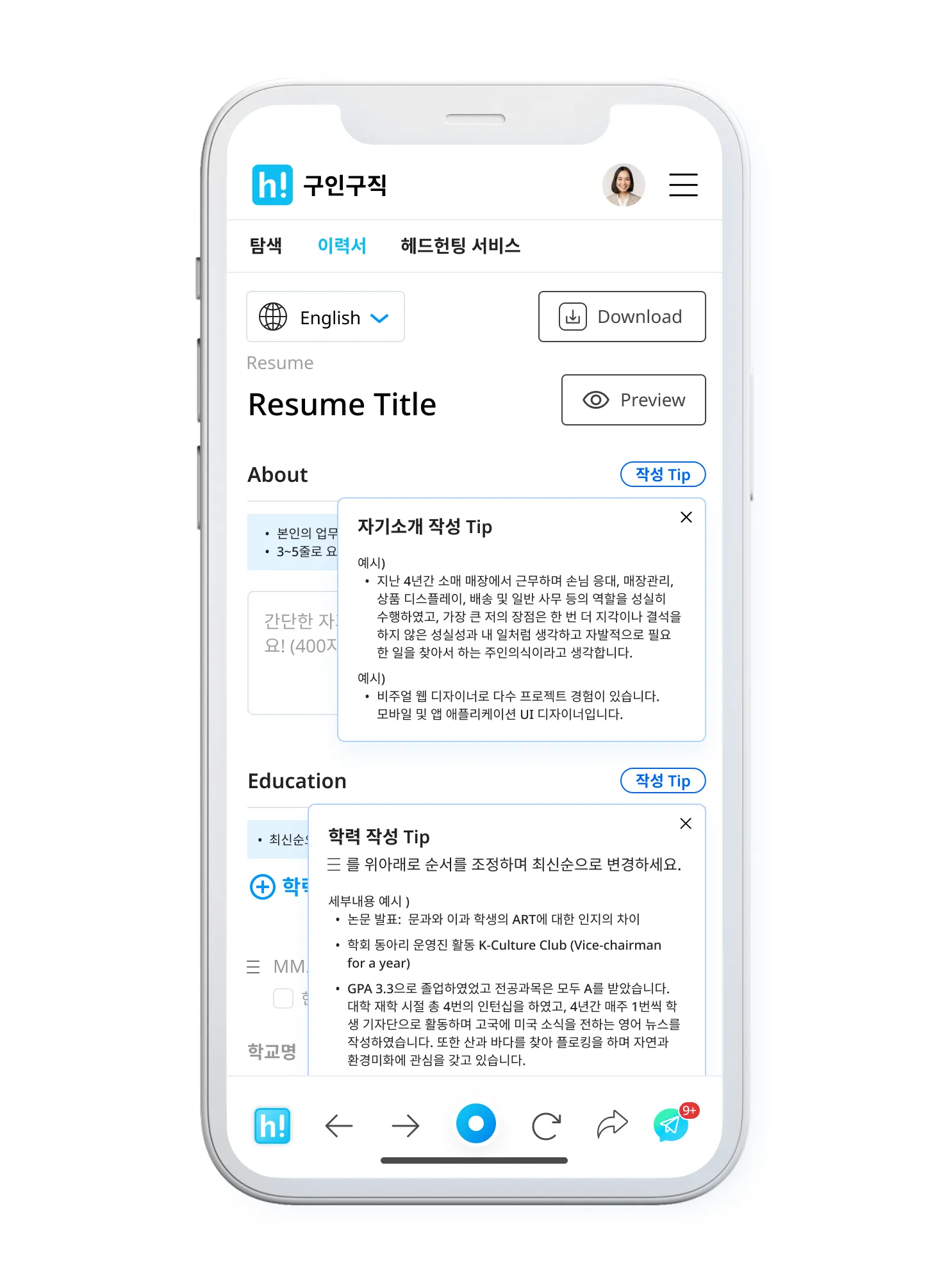 메인 페이지 상단의 ‘이력서’를 선택하여 Global Standard에 걸맞는 헤이코리안만의 이력서를 완성해 보세요.