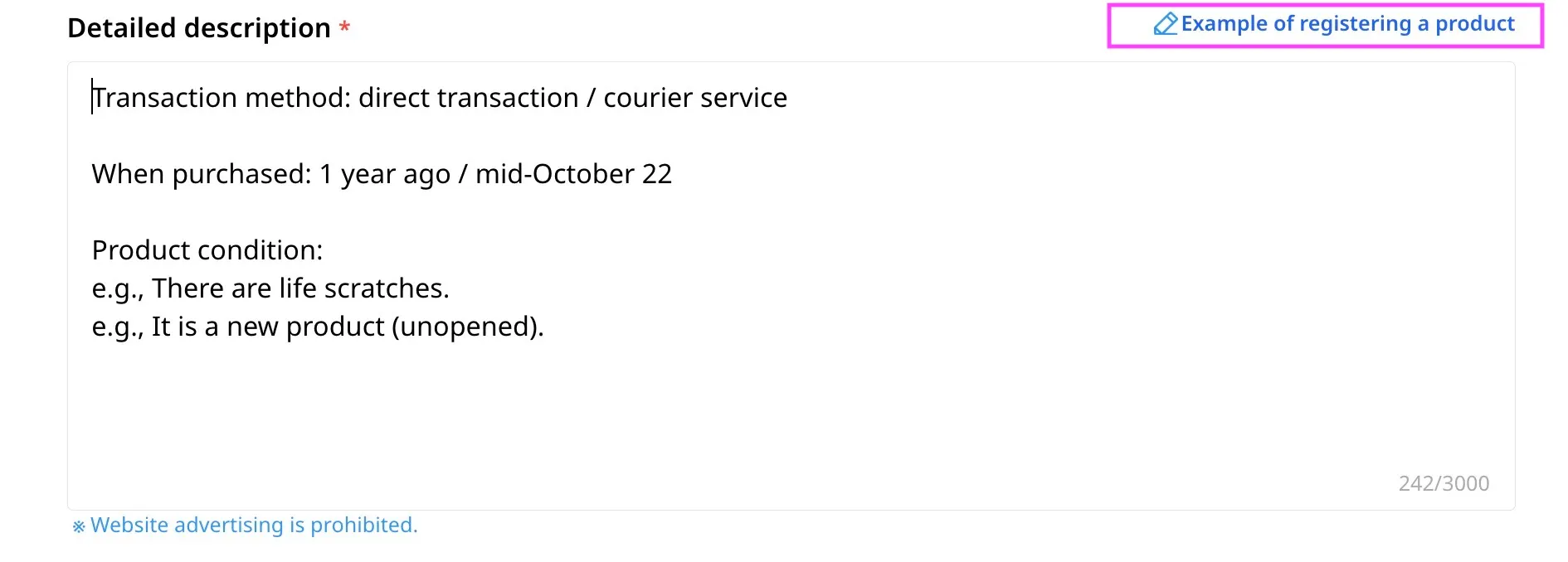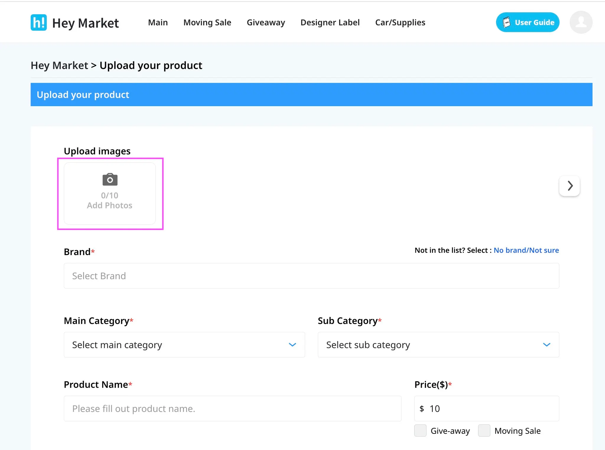 On the product registration page, first click on the camera to upload photos. You can upload up to 10 photos, and multiple photos can be uploaded at once.