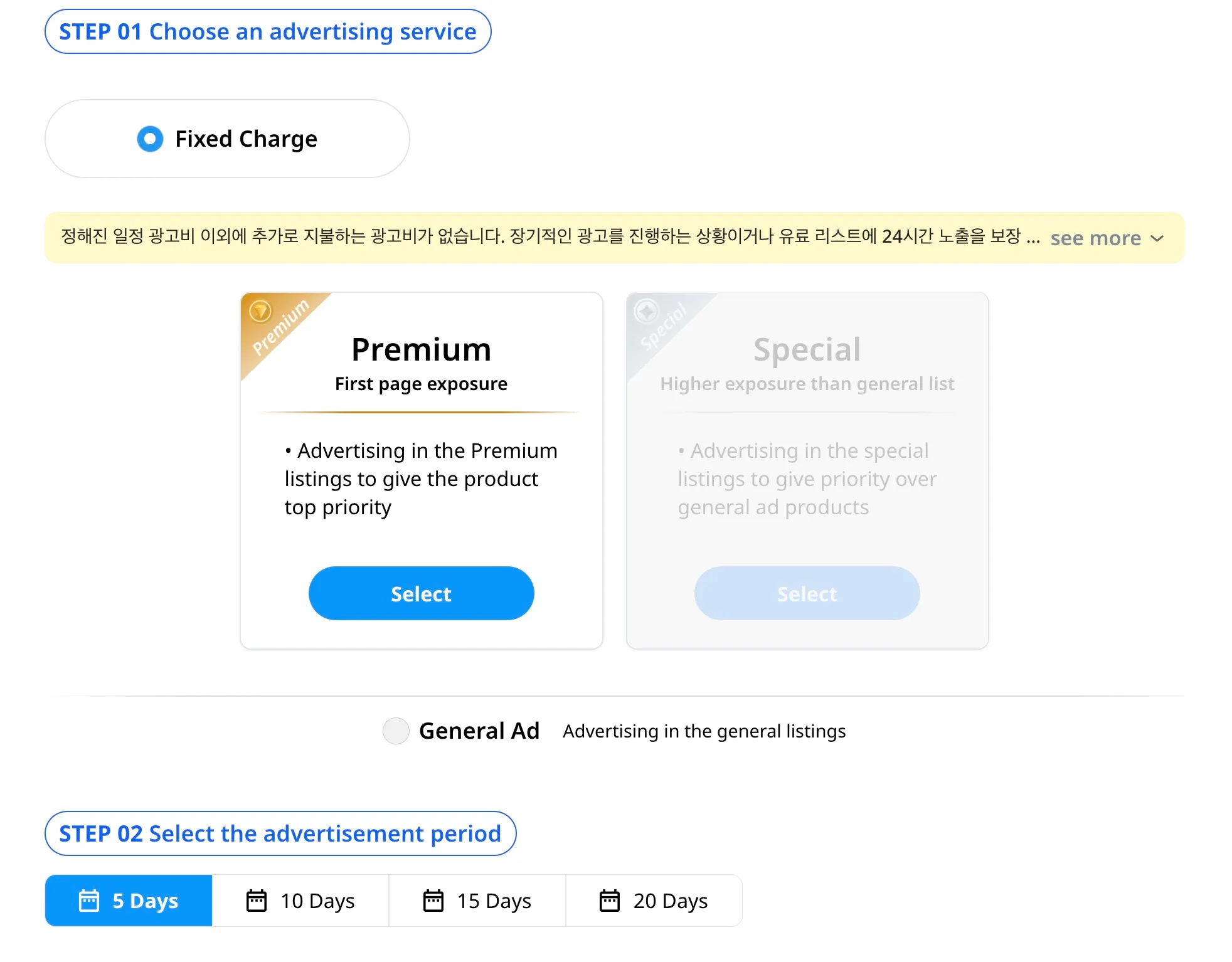 For standard advertisements, there's no need to select a duration as it will be listed as standard. Once the advertising period for Premium and Preferred posts ends, they will automatically be changed to standard exposure.