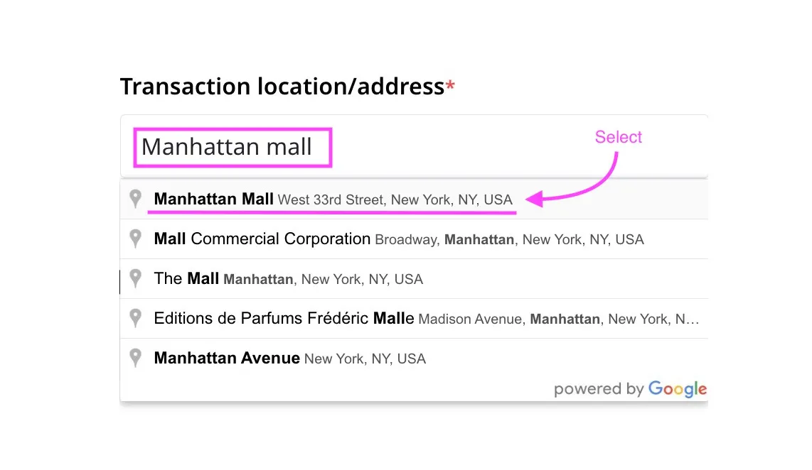 Enter the transaction location/address(Indicating a rough transaction location is sufficient.) After typing, please select one of the recommended addresses provided below. There's no need to input detailed parts of your actual residential address, such as floor level or suite #.