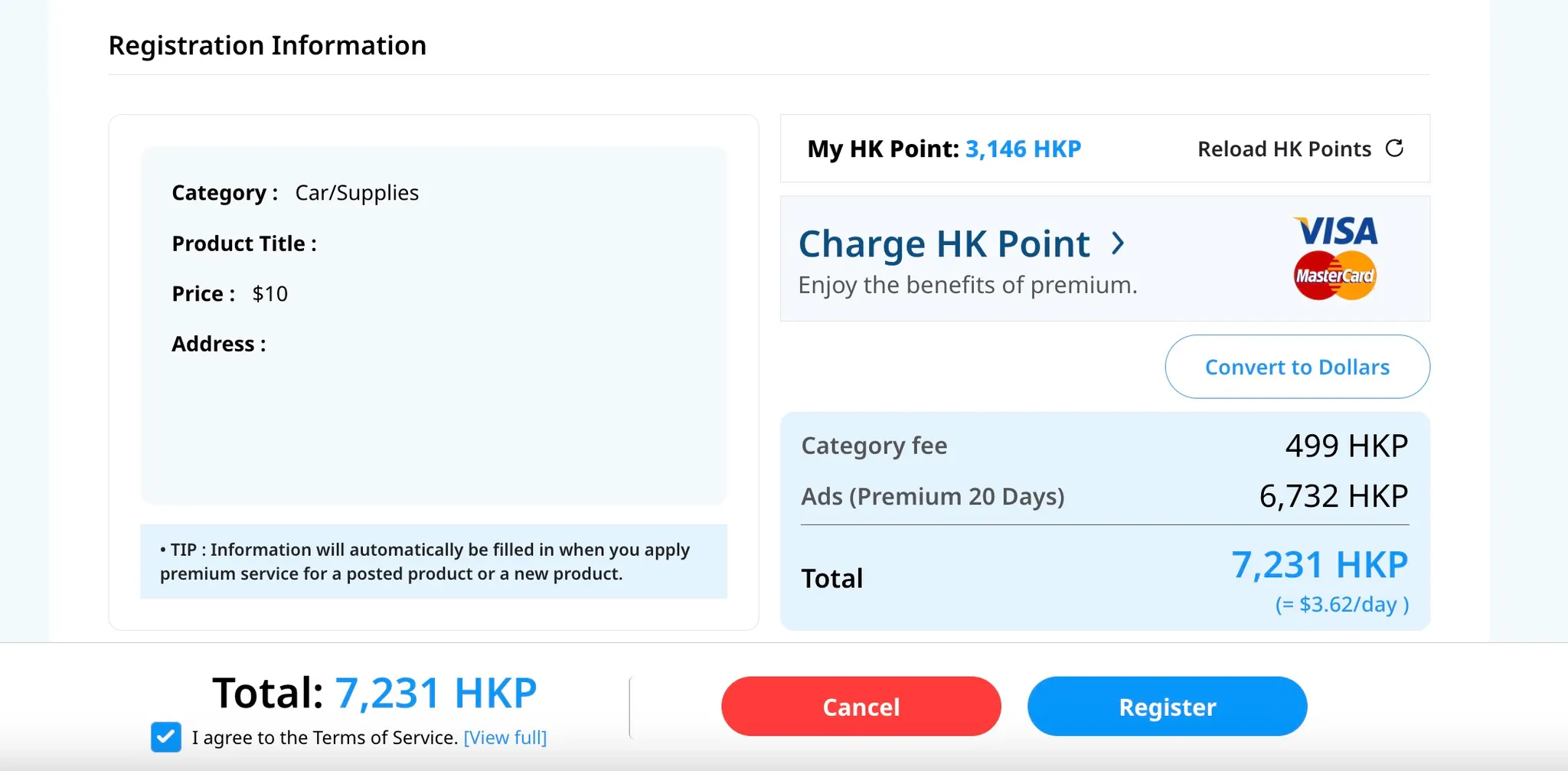 After verifying the payment amount, check the box indicating agreement to the 'Terms of Service'. Then, by clicking the 'Register' button, your post will be completed.