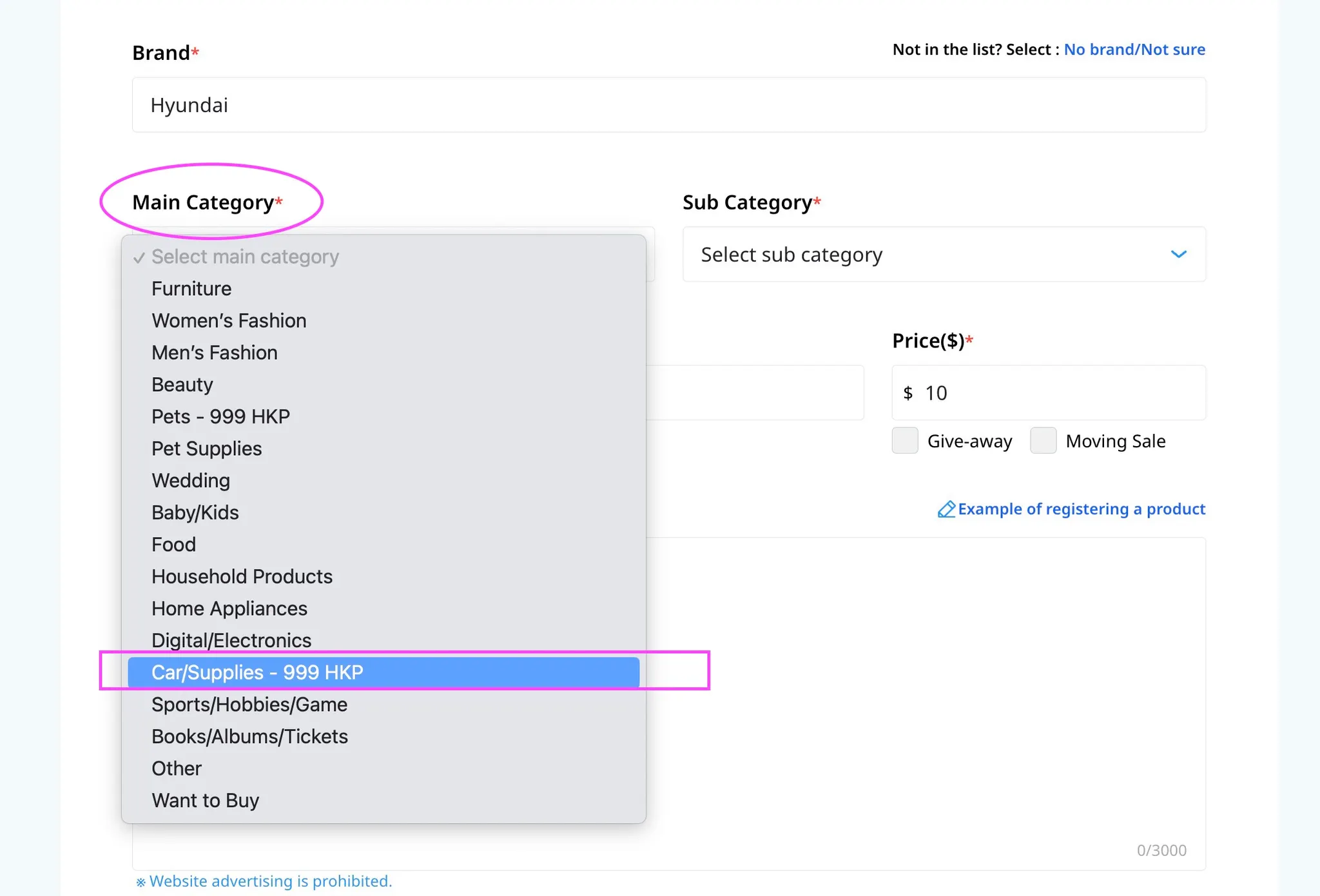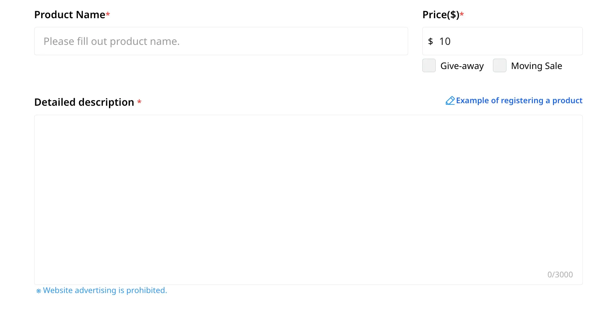 Enter the product name and price, and check if it applies to free giveaways or moving sales.