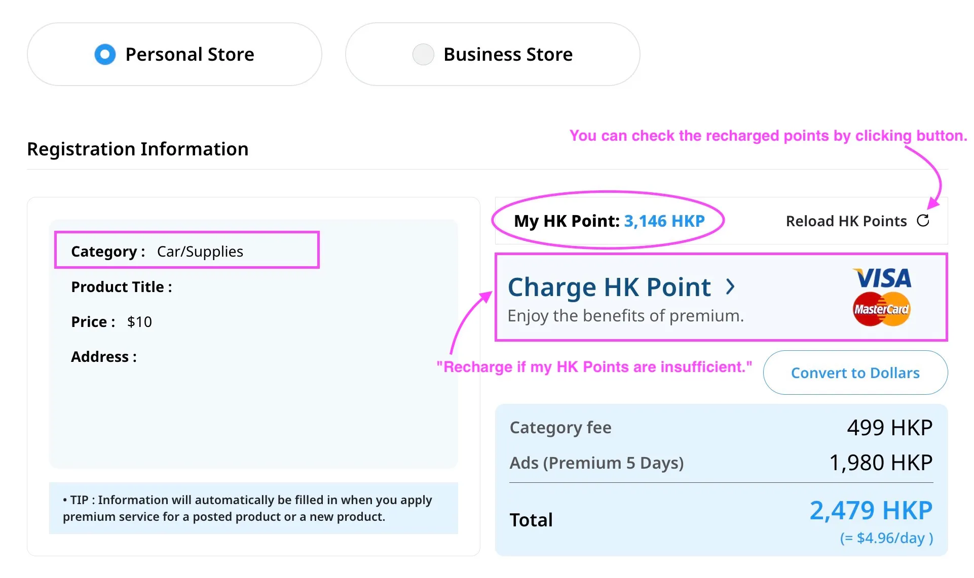 Lastly, check the application details on the left. If you've applied for a paid product, verify your HK points and the payment amount. If you're short on HK points, click on 'Recharge HK Points' to top up. If you're not a business or haven't applied for a paid product, the payment amount will be 0HKP."