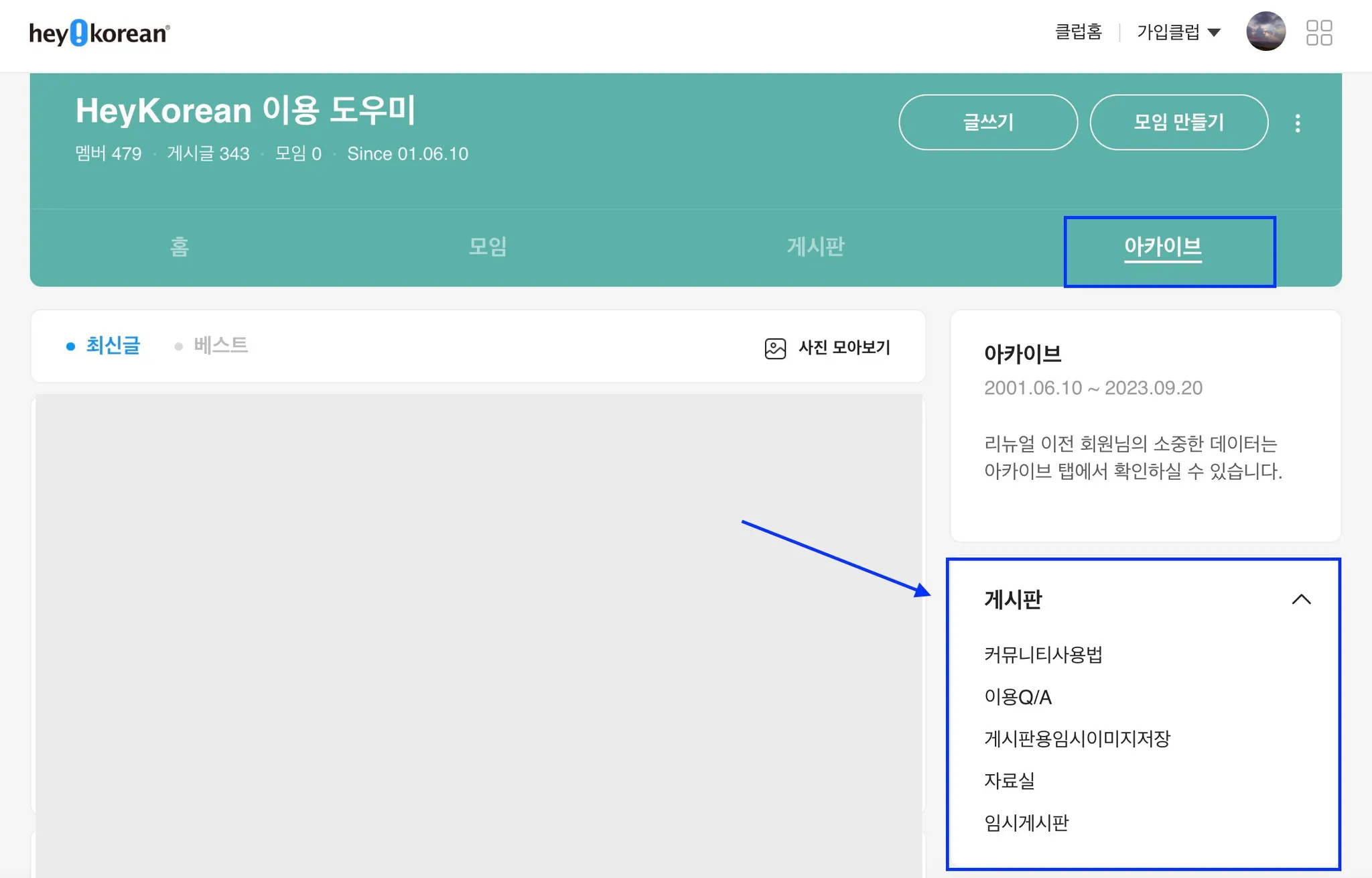 다만, “아카이브” 게시판에 별도로 보관되어 회원님들의 기존 게시글을 온전히 열람을 하실 수 있지만, 아카이브 용은 열람전용으로 새 글은 글쓰기 버튼을 통하여 작성하여 주면 됩니다.