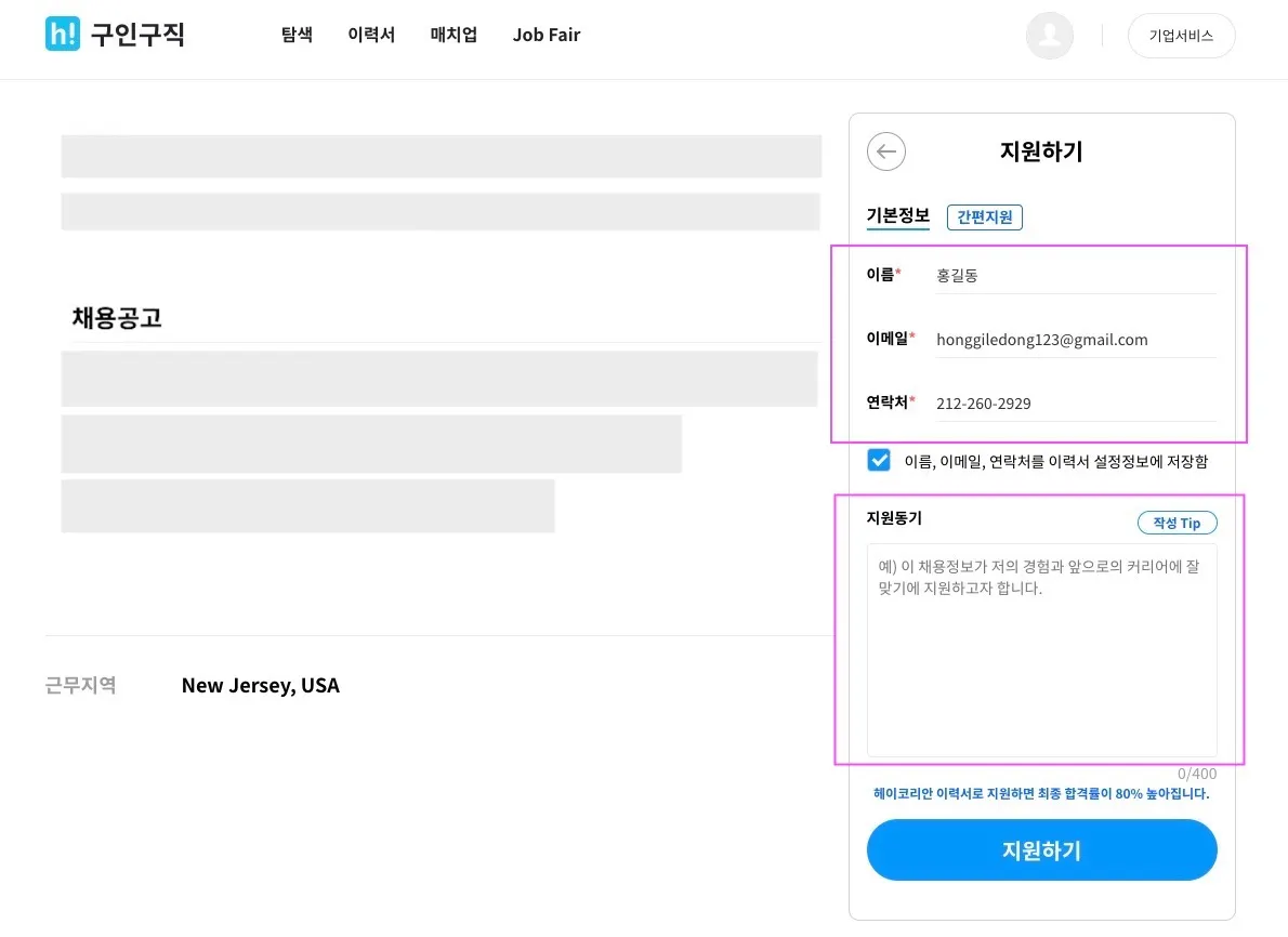 지원자는 회원님의 연락처가 없더라도 오른쪽에 지원하기 버튼을 통해서 지원합니다.